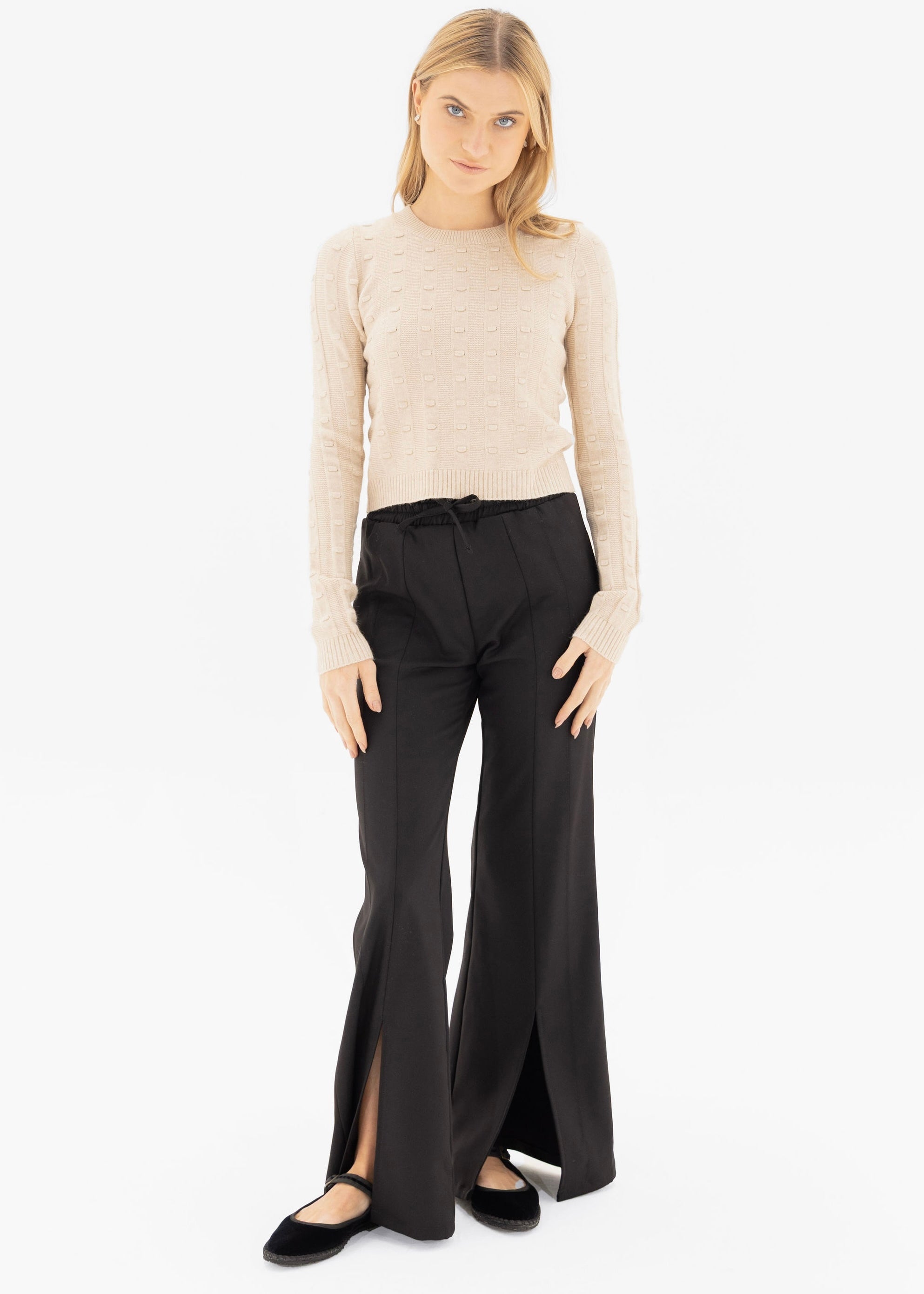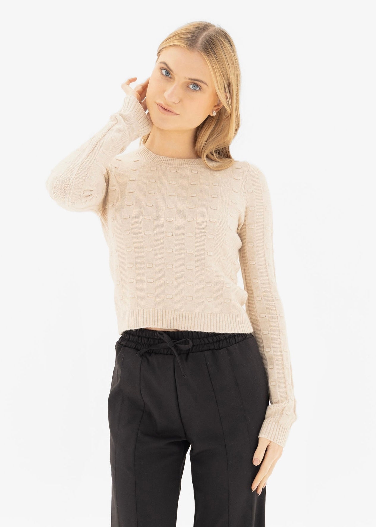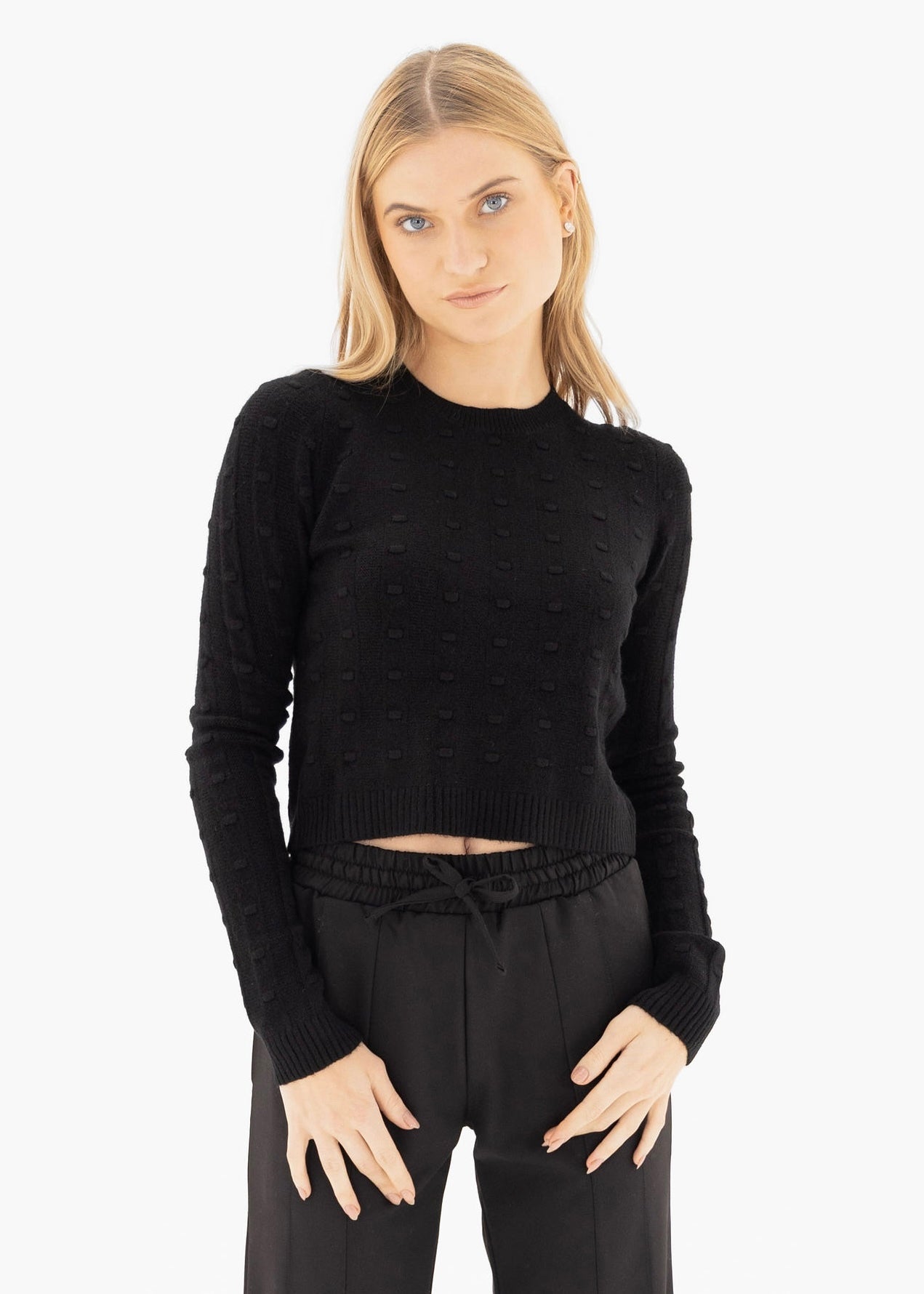 This cozy, slightly cropped sweater brings all the charm with its soft feel and polka texture. A go-to for casual, cute days.