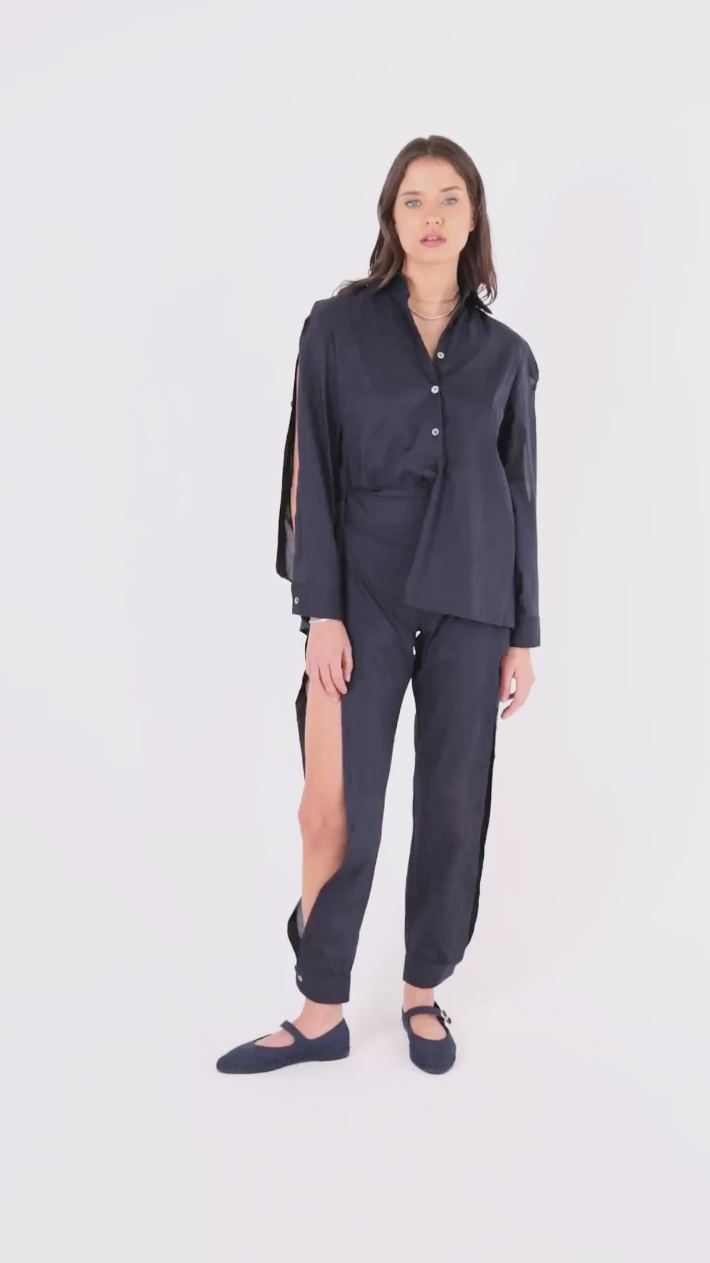 Innovative blue cotton timeless pants, they are crafted from soft & breathable cotton. Featuring shell buttons, they match its shirt and  can be worn as shorts or pants. You can open or close them as much as you want, offering you two looks in one!